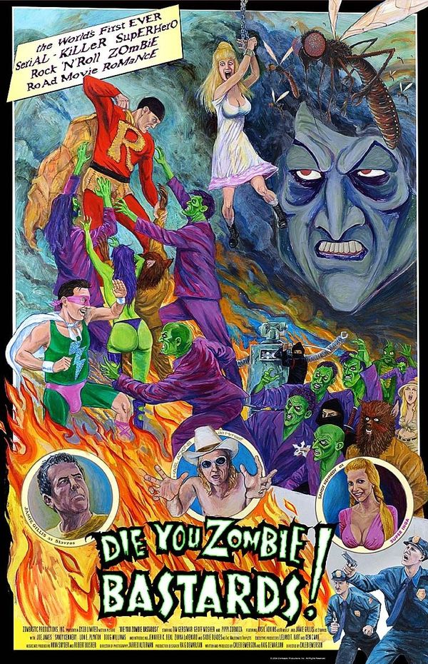 Die You Zombie Bastards! (https://www.imdb.com/title/tt0349349) is the world’s first ever serial killer super hero zombie rock’n’roll road movie romance! Directed by Troma alumni Caleb Emerson, with a script by Emerson and Haig Demarjian, the film follows Red, a serial killer superhero, who has to get his kidnapped cannibal wife Violet back from the evil Baron Nefarious before he turns her into a zombie with his Zom-Ba-Tron! Expect nothing to be taken seriously and everything to be amped up to 11 on this cult film. It’s bloody, it’s offensive, it’s hilarious, it’s got giant green zombie dicks and purple topless zombie girls. It’s an experience you won’t forget, and it was shot on glorious 16MM film!